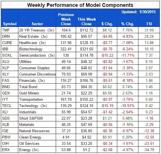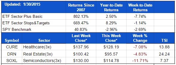 Our three positions are CURE, DRN, and SOXL (with just DRN in the Stops & Targets model). The model will be rotating out of SOXL into TMF for both the Basic and Stops & Targets. That position change will happen based on the opening price on Monday 2/2/2015.