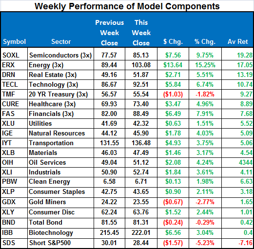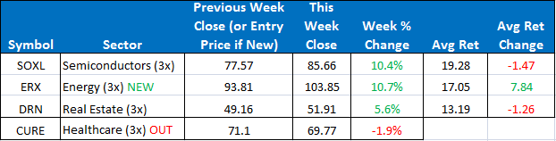 This week we issued one change in the model. On Monday evening we initiated a signal to replace CURE with ERX on the open Tuesday. We closed out our CURE position with a 12.26% profit. To open next week, we will be in SOXL, ERX, and DRN.