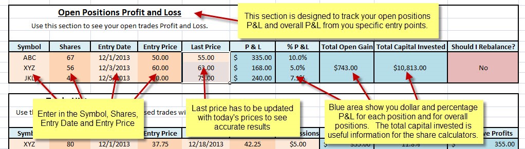 This section has two parts. The top section tracks the P&L of your open trades. The bottom section can keep track of all of your closed trades and the cumulative P&L from those trades. For the top section, enter in the symbol, share numbers, entry date and entry price into the tan section. This will only have to be done once per trade. In the “last price” column, you can update the latest market prices whenever you want to see the latest P&L. This can be done daily or whenever you wish to evaluate the open P&L. The results are displayed in the blue section. I will cover the rebalance functionality in the next installment of this series. These tools are optional and any brokerage platform should track your open P&L.
