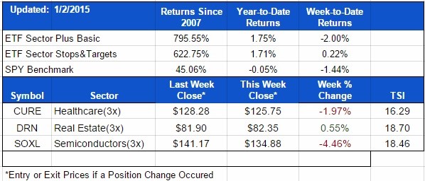 Our three positions remain CURE, DRN, and SOXL (with just DRN in the Stops & Targets model). Santa Clause was missing in action as the broader markets sold off considerably this week and closed out December in the negative. Stay tuned to daily updates for any position changes. Stay tuned to daily updates for any position changes.
