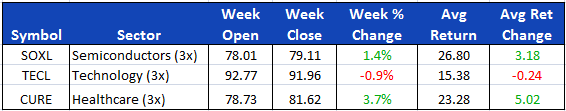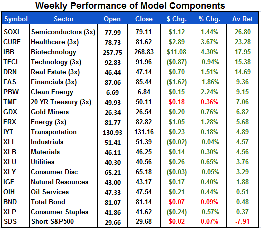 Here is a summary of the weekly performance of all the ETFs that the strategy monitors:
