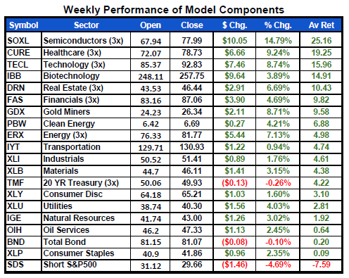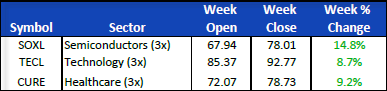 This week there were no position changes in the strategy. We continue to hold TECL, SOXL, and CURE. Technology, Semiconductors, and Healthcare continue to be the three leading sectors.